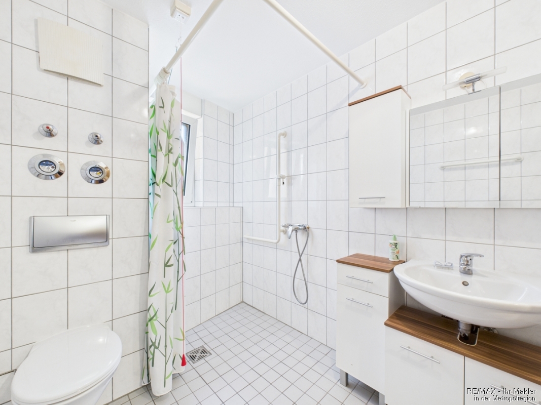 Beim Betreten der Wohnung gelangen Sie in den großzügigen Flur mit Einbauschrank, Das helle Tageslichtbad ist mit einer ebenerdigen Dusche, WC und Waschbecken ausgestattet und bequem vom Flur aus erreichbar.